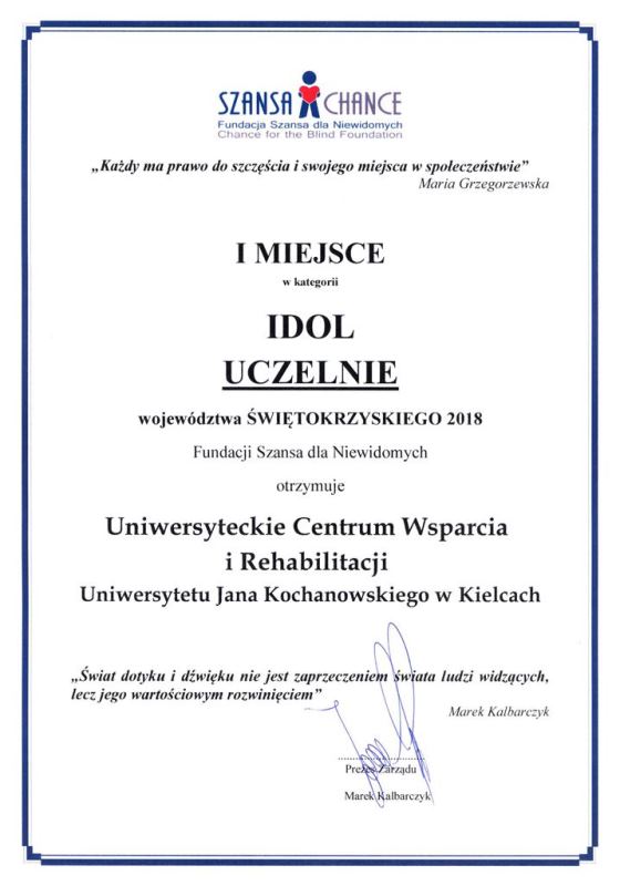 Uniwersyteckie Centrum Wsparcia i Rehabilitacji zajęło pierwsze miejsce w kategorii IDOL UCZELNIE województwa świętokrzyskiego 2018. Wręczenie dyplomu odbyło się w ramach konferencji zatytułowanej „Zamknij oczy, zobacz więcej – świat otwarty dla niewidomych”, zorganizowanej przez Fundację Szansa dla Niewidomych, która odbyła się 21.06.2018 r. w Muzeum Dialogu Kultur w Kielcach.