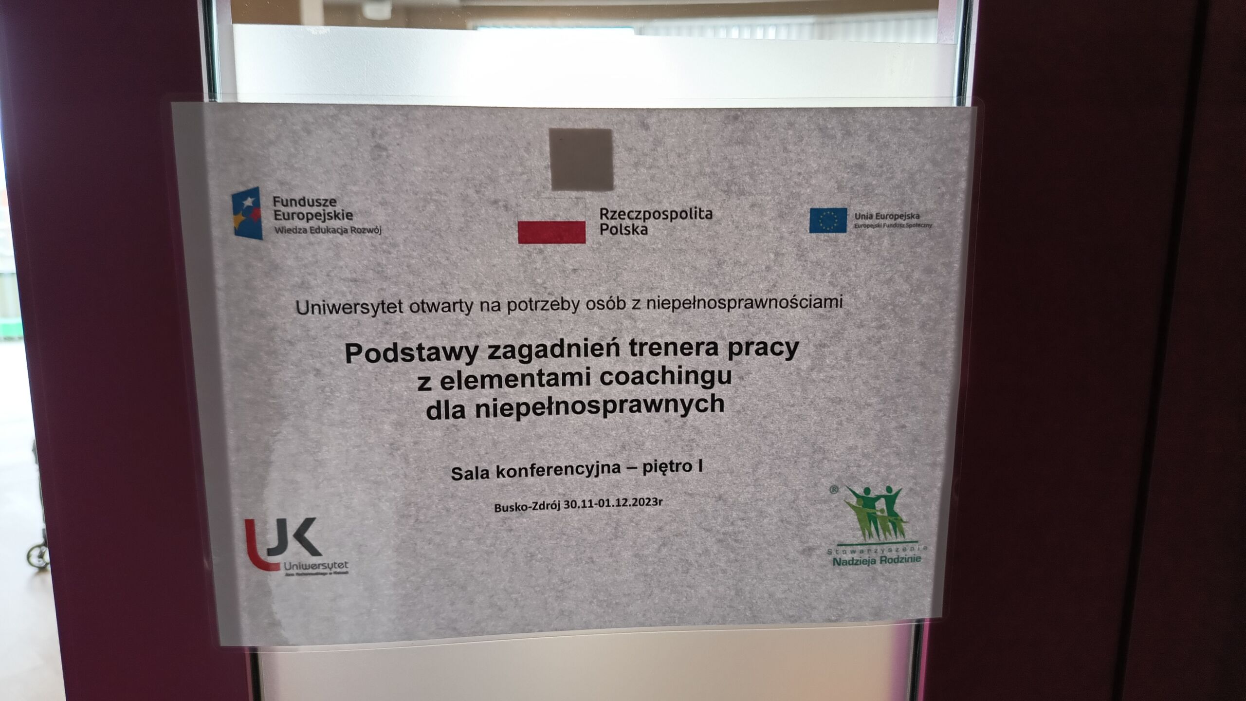 W dniach 30.11.2023 r. – 01.12.2023 r. pracownicy Centrum Wsparcia uczestniczyli w szkoleniu „Podstawy zagadnień trenera pracy z elementami coachingu dla osób z niepełnosprawnościami” zorganizowanym w ramach realizacji projektu „Uniwersytet otwarty na potrzeby osób z niepełnosprawnościami” przez partnera projektu Stowarzyszenie Nadzieja Rodzinie.