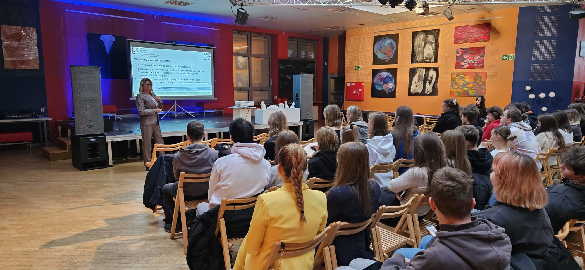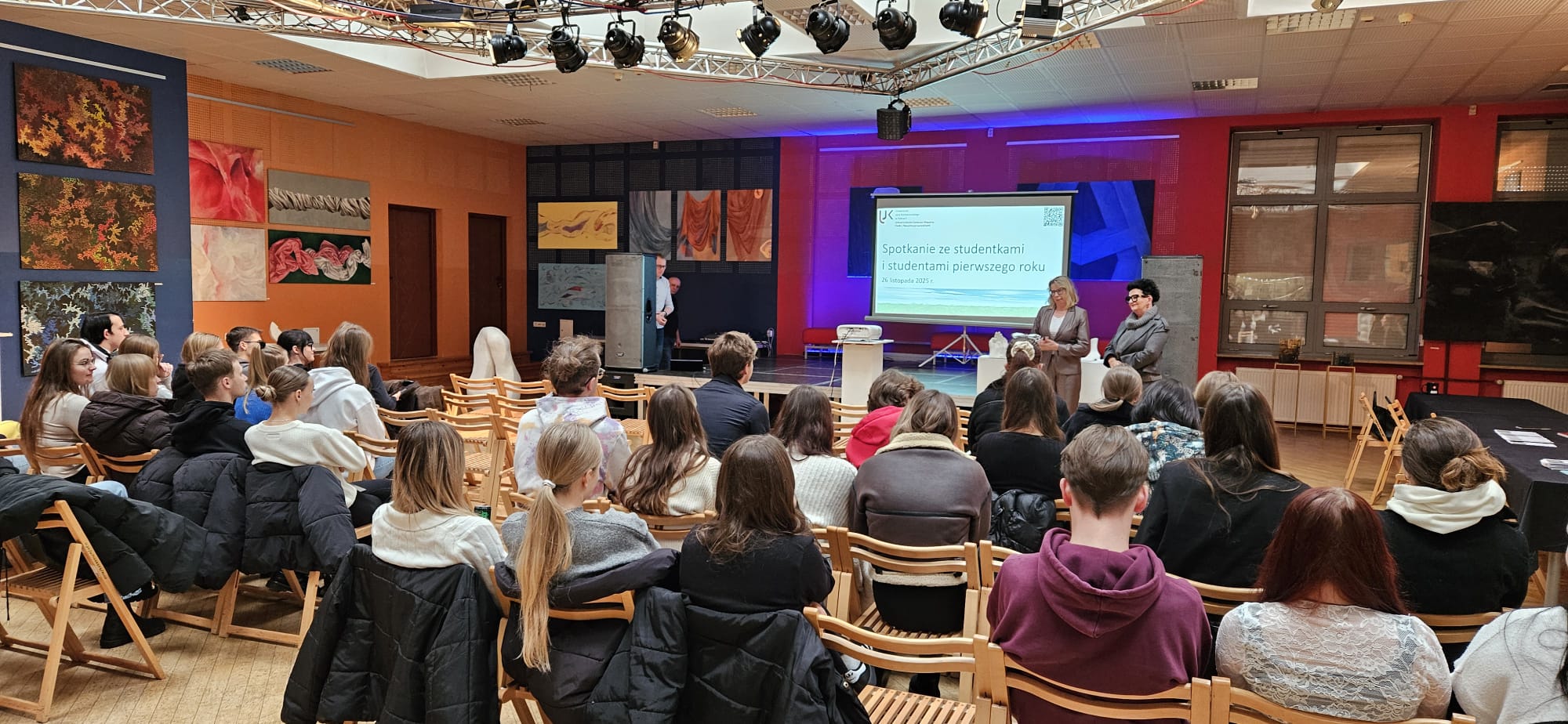 27 listopada 2025 Sebastian GrabekW dniu 26 listopada w Studenckim Klubie Wspak odbyło się spotkanie z przedstawicielami studentek i studentów pierwszych roczników. Uczestników przywitała Prorektor ds. Kształcenia dr hab. Mariola Wojciechowska, prof. UJK zachęcając do zgłaszania się po wsparcie i pomoc do odpowiednich jednostek w uczelni, a także do tworzenia wspólnej przestrzeni Klubu Wspak.